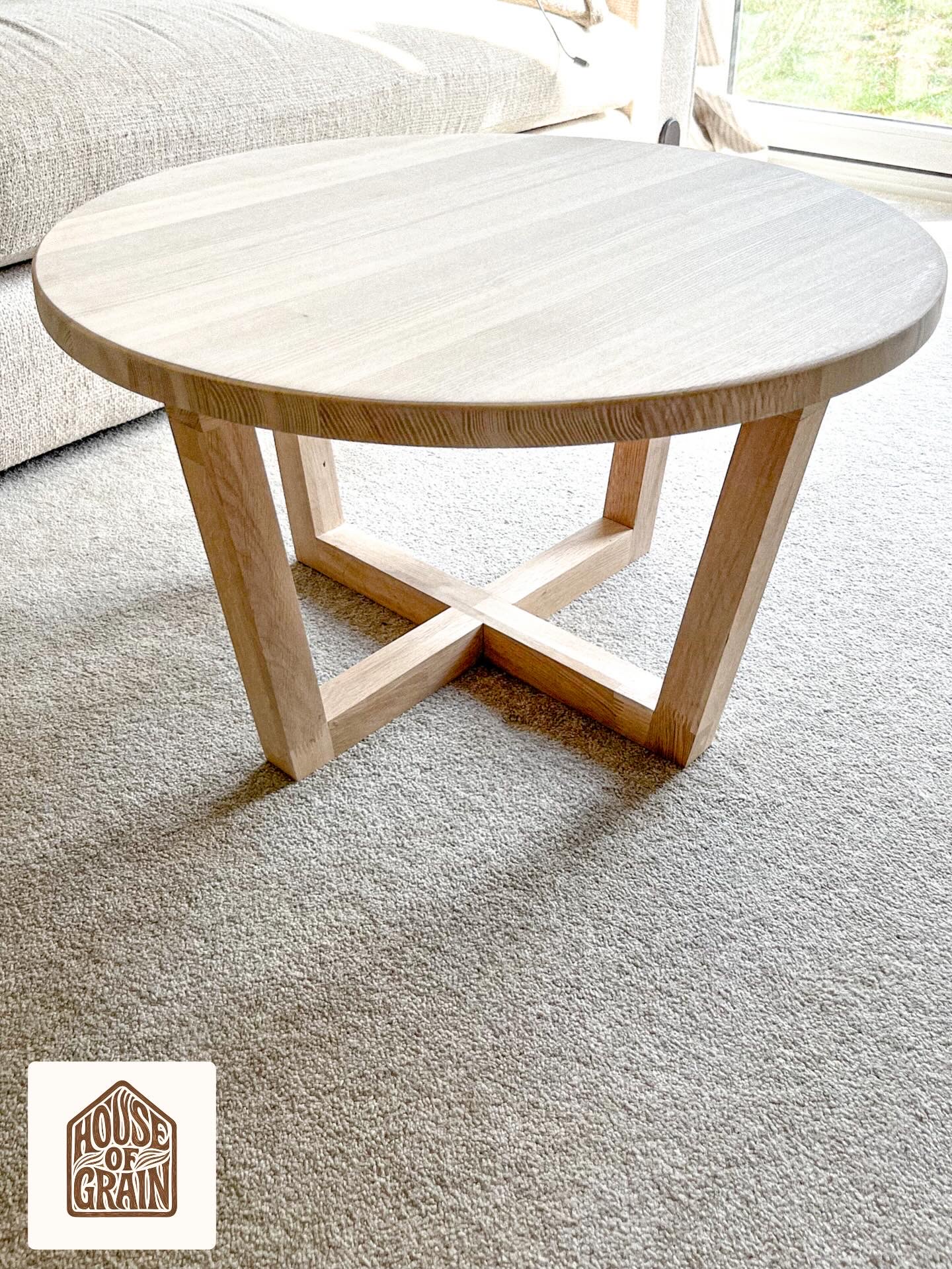 Modern & simple design. Beautiful table with a clear matt varnish to protect the grain and table. Bring warmth and modern simplicity into your living space with this handcrafted round coffee table by House of Grain. Made from solid oak, this table features a smooth, beautifully grained top and a unique geometric base that blends…